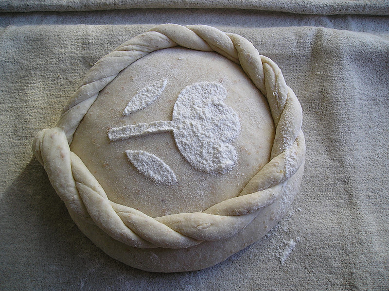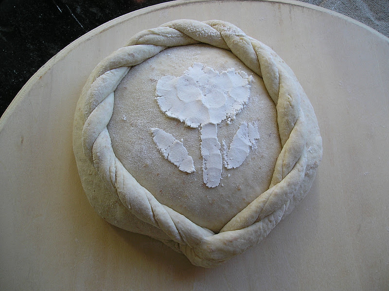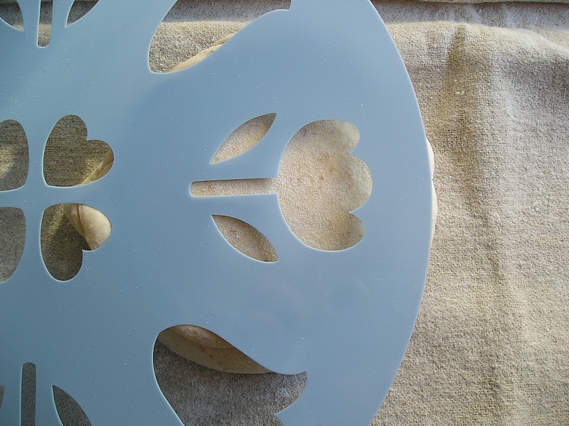 Colocar sobre la pala o bandeja con la que vayamos a llevar el pan al horno. Con un plantilla espolvorear harina con cuidado para hacer el dibujo o “estarcido”. Mi secreto para espolvorear es una reinvención del colador que me enseñó mi madre de pequeña. Era muy útil, desde luego, para espolvorerar azúcar glas o cacao. Pero el gran descubrimiento para mí ha sido utilizar una bola de infusión. De esa manera la harina no se escapa en goterones al mover el “colador”. Muevas como muevas la bola de infusión, la harina siempre cae en una lluvia fina, fina.