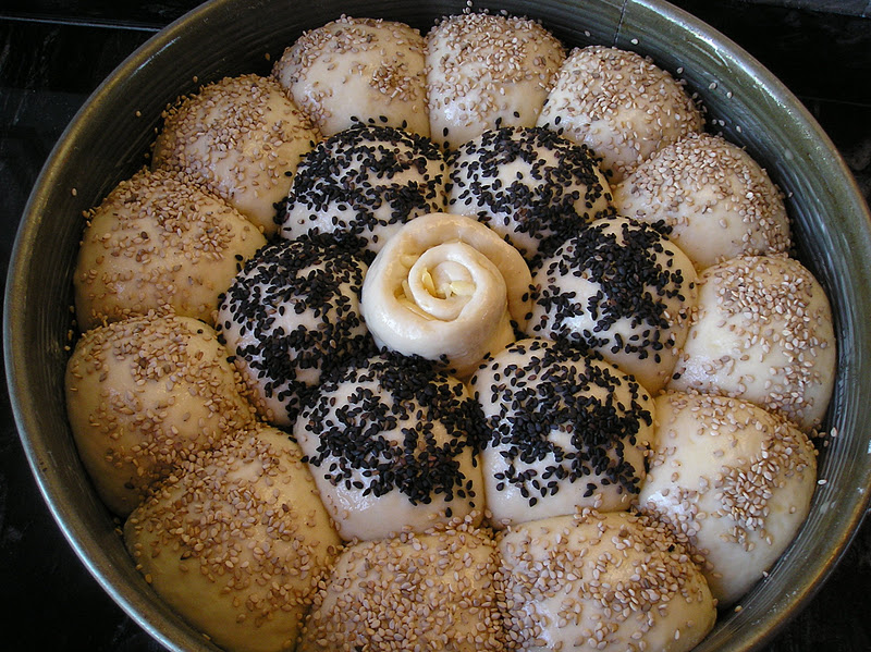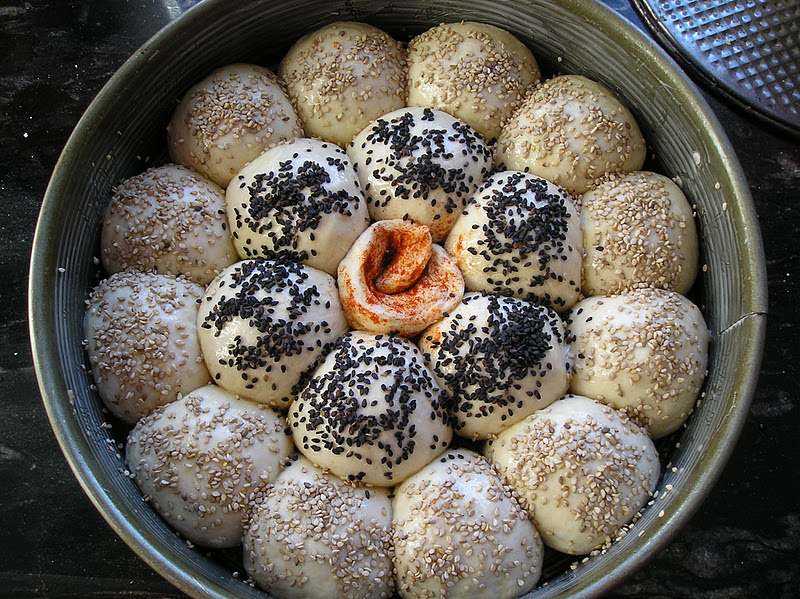 Es un pan maravilloso: si se prepara el doble de masa, utilizando una buena harina de fuerza y se refrigera tras una primera hora de fermentación a temperatura ambiente, puede mantenerse en la nevera hasta 3 días. Ello nos permite tenerla hecha un par de días antes de que comience la locura navideña. Y luego sólo haya que sacar la cantidad de masa necesaria, formar las bolas y colocar en un molde engrasado. Eso sí, necesitará una fermentación más larga. Una idea que a mí me funciona es dejar preparado el molde con sus panecillos la noche antes de hornear y dejarlos fementando en un habitación que no esté cálida de la casa (pero fuera de la nevera). A la mañana siguiente estarán listos para darles un baño de huevo, decorar con semillas y hornear.En las fotos se ve muy bien cómo los bollos han ido fermentando hasta alcanzar una buena expansión. En la dos fotos de abajo, se aprecia la espiral central con dos acabados distintos: uno lleva pimentón y el otro queso rallado.
