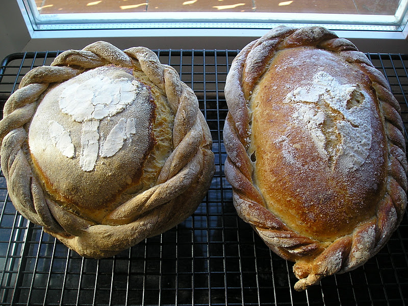 Con esta misa técnica de “decoración con plantilla” combinada con la técnica de los cordones he hecho estos panecillos para una comida con amigos. Cada pan pesaba unos 400 gramos. El resultado fue estéticamente aceptable. En el pan redondo, hice el adorno antes de colocar en el pan en la pala. Cuando tueve que mover el pan al horno se movió toda la harina. Lo arreglé aplastándola con el dorso de una cucharilla. No quedó del todo mal; no llegan a Pankenstein, pero no salieron cómo yo quería. En el pan ovalado tomé más precauciones y lo coloqué en la pala antes de decorarlo, pero luego en el horno el pan se greñó solo precisamente por la zona donde estaba el dibujo.