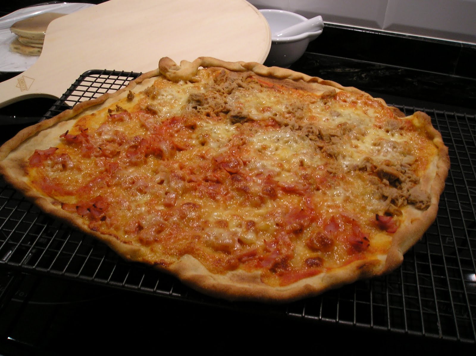 Cada domingo -salvo excepciones- preparamos una pizza. Y siempre es muuuuuuuuuuy grande: aprovechamos el super horno de 90 cms, en el que cabe una bandeja que tiene 40×55 cms. Toda ella es un pizza gigante, que queda muy vistosa con todas las posibles combinaciones de sabor.