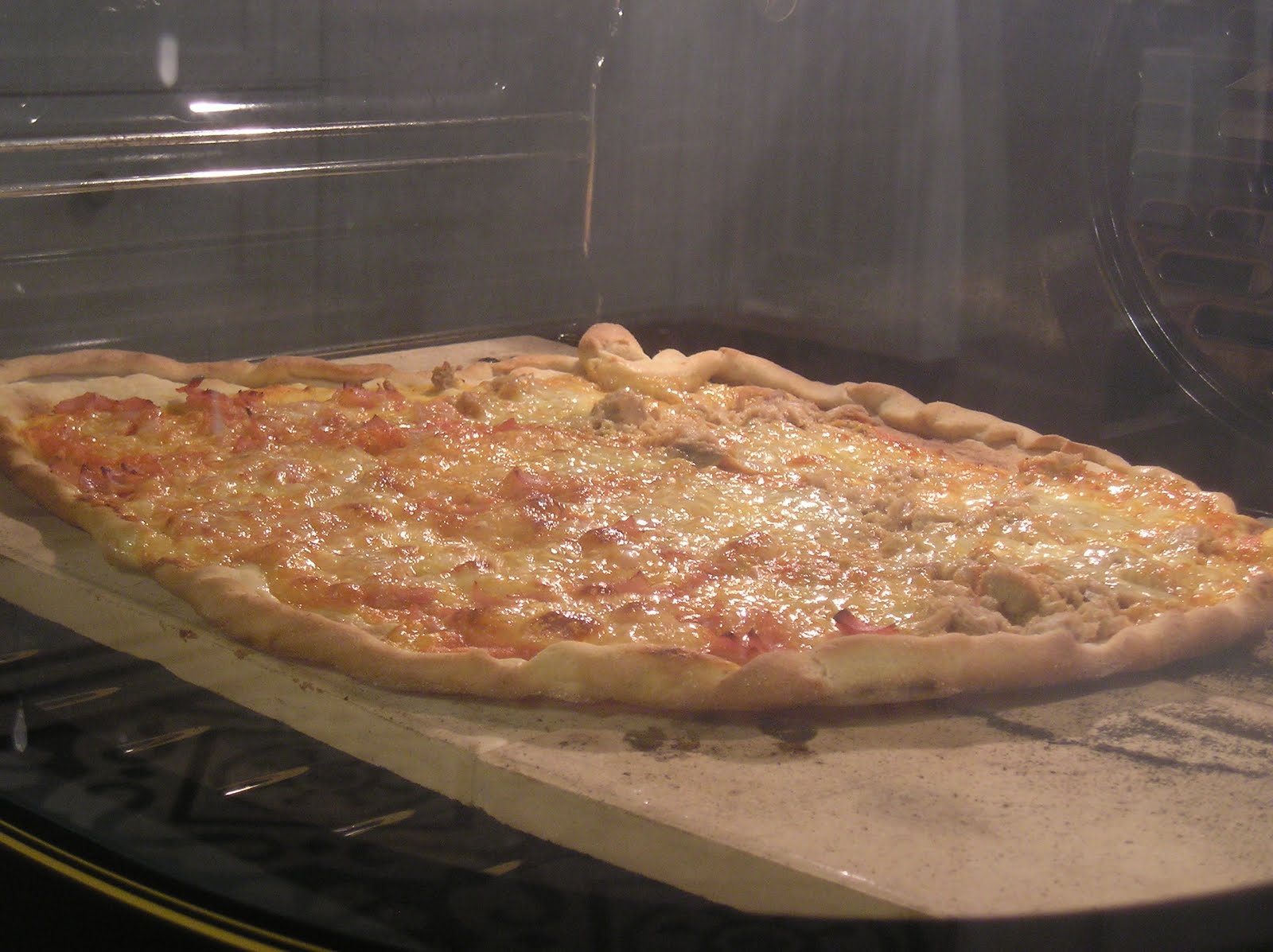 Y la temperatura del horno en el mío llega a 250º tan sólo. Pero si tu horno tiene más temperatura, mejor para la pizza. Es de las pocas cosas que gana con un horno muy caliente: se hornean a alta temperatura, poco tiempo. Los hornos profesionales para pizza llegan a 350º, pero claro, eso no se consigue en un horno doméstico.