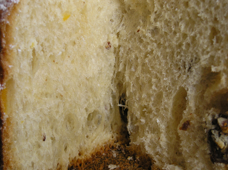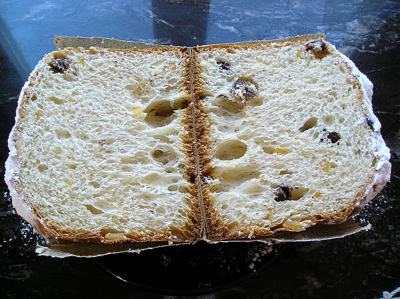 El panettone pequeño lo comimos a los 4 días de su horneado y estaba bueno. El segundo panettone fue un regalo y se comió a la semana de su horneado. El tercer panettone se ha abierto a las dos semanas del horneado y este es el resultado del interior.