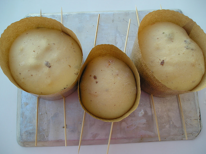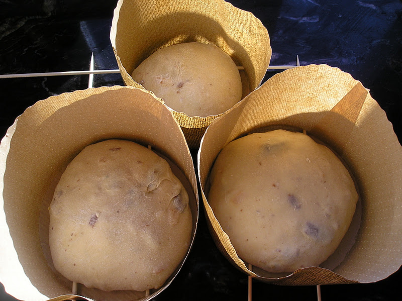 Se forma en una bola. Antes de colocarlo en el molde, se insertan dos palillos largos (de pinchos morunos, por ejemplo) en el fondo del molde. Se coloca la masa encima. Estos palillos nos permitirán luego colgar los panettones invertidos para que se enfríen sin perder volumen.