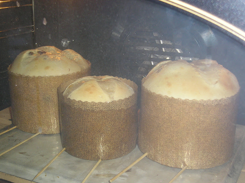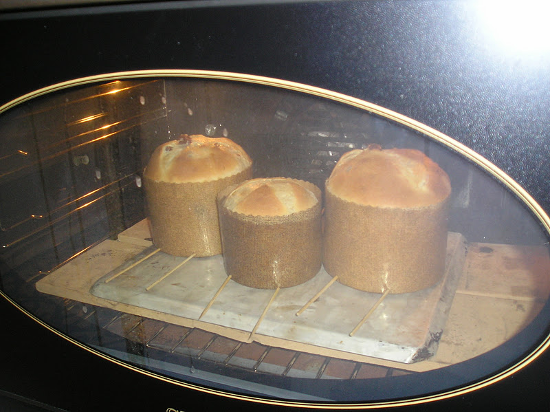 Una vez horneados, se colocan los panettones invertidos y suspendidos por los palillos para que se enfríen.