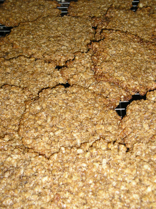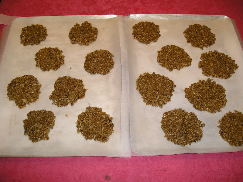 Hornear de 10 a 15 minutos tan sólo, con cuidado de que no se quemen, pues la miel hace que se caramelicen muy pronto. Dejar enfriar sobre una rejilla para que queden crujientes.