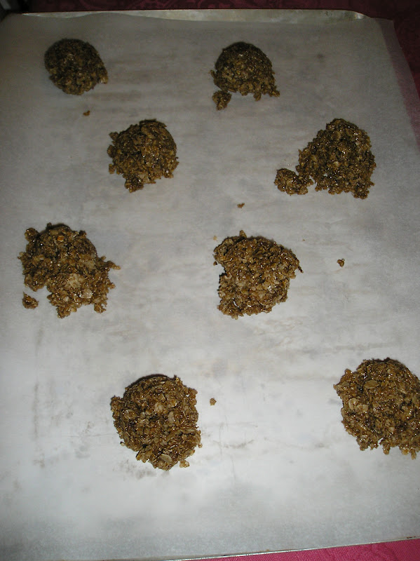 En una bandeja de horno cubierta de papel de hornear colocar cucharadas de masa separadas varios centímetros unas de otras (en una bandeja de 25 x 35 cms. coloqué 9 galletas).