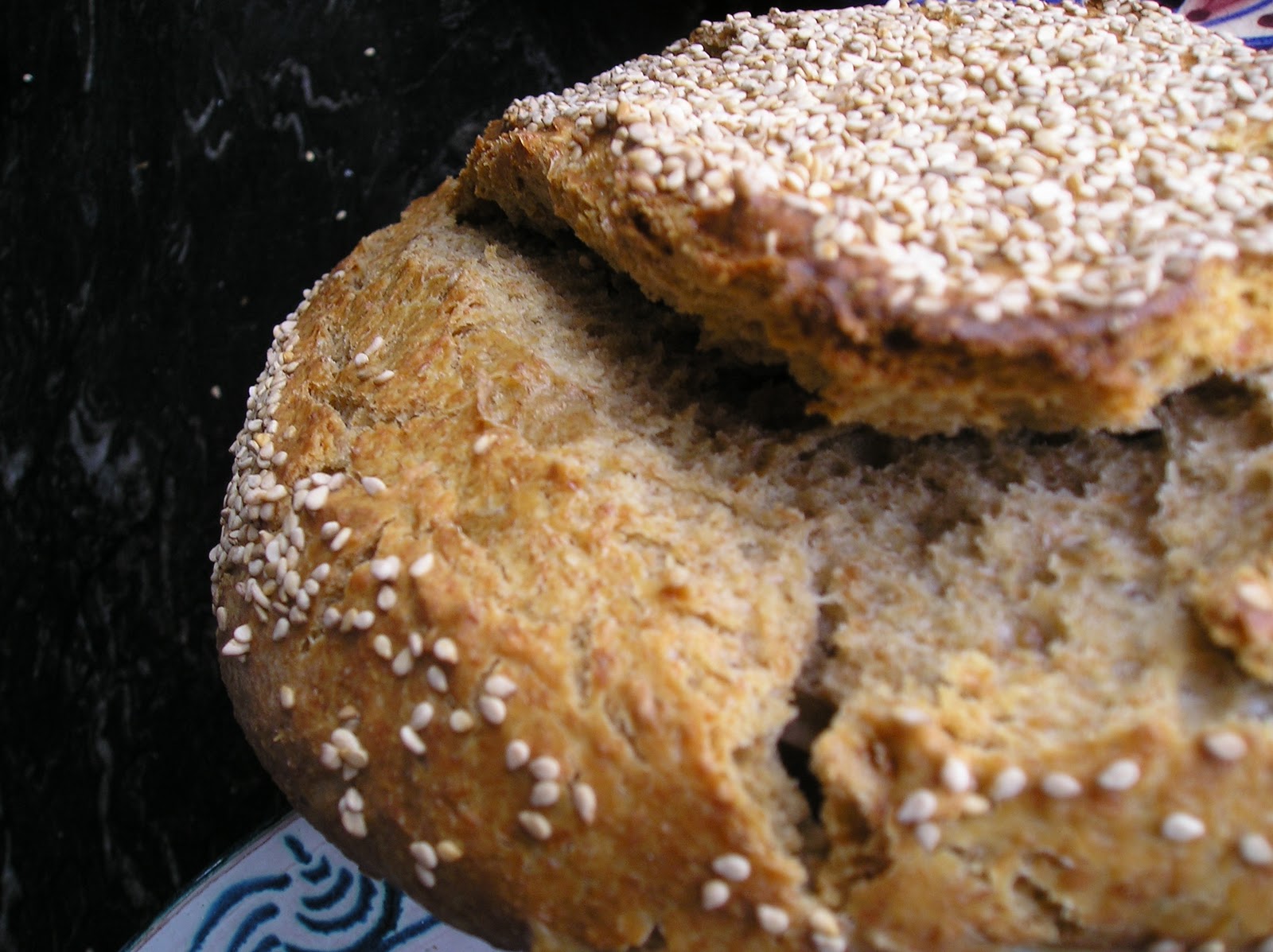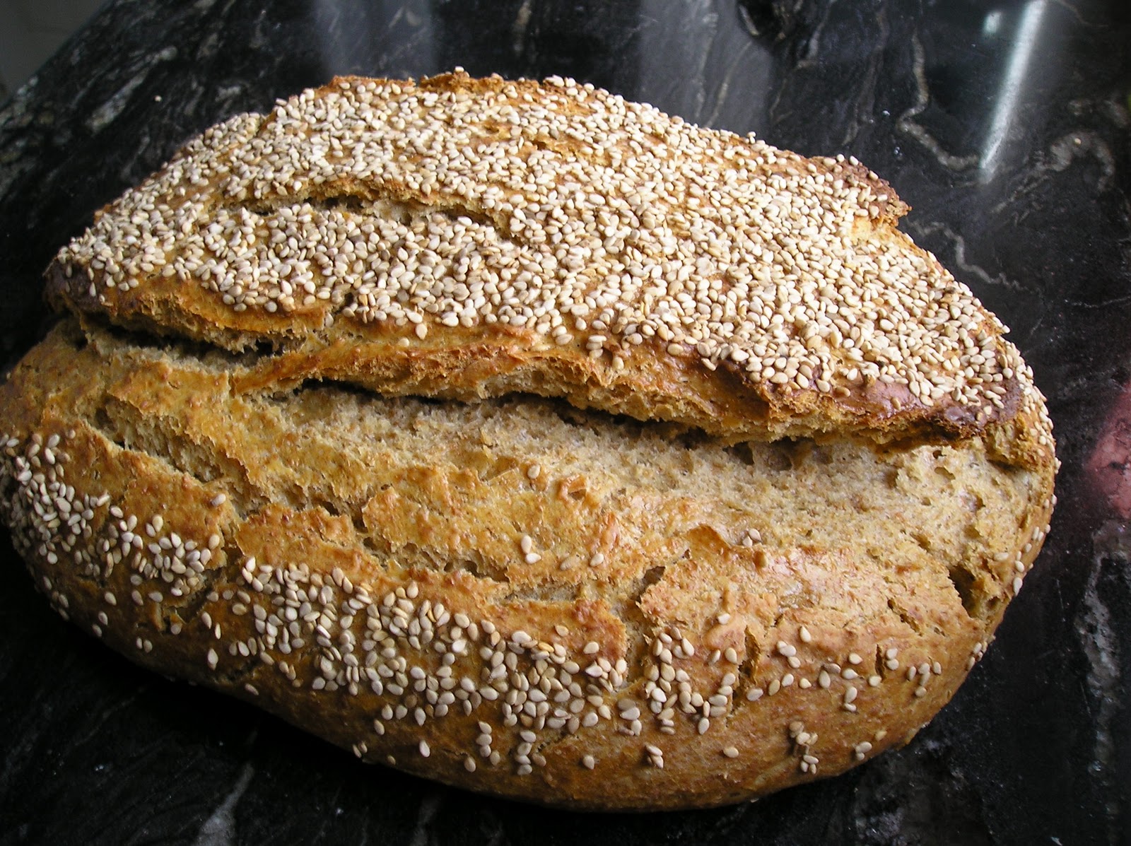 Y es que lo amasé al atardecer. Mi plan era darle forma, encestarlo y meterlo en la nevera antes de irme a dormir. Pero la realidad fue que se quedó sin formar, sin encestar y sin nevera. Esta mañana y tras 18 horas de fermentación en mi cocina cálida, me encontré algo así como un barro lleno de pequeños hormigueros, desinflado y con un fuerte olor ácido. Aún así, y por aquello de que la curiosidad mató al gato y no a la mujer, lo formé, encesté y llegada su hora lo hornée. Para disimular los posibles defectos de la falta de estructura -que se veia venir, vaya si se veía venir- lo espolvorée de sésamo.