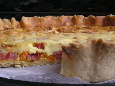 Pero por el momento -y esperando que ella publica su receta y trucos y consejos- os dejo con esta quiche, fruto de mi cocina. He querido combinar color y sabor: lleva pedacitos asados de calabaza, tacos de jamón york y dados de queso de cabra. Pero la próxima vez añadiré guisantes verdes tiernos y frescos para lograr el verdadero y completo efecto multicolor y primaveral.
