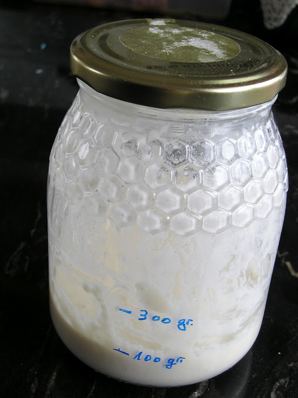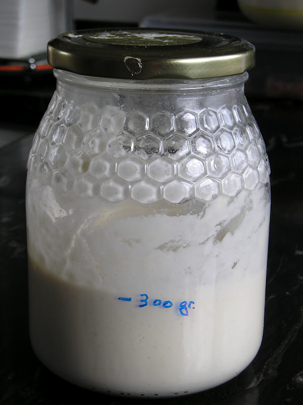 Las marcas no incluyen el “resto” permanente que fermenta: suelo utilizar toda la MM y dejo 50 gr. en el bote, con la apariencia de: “¿Pero qué has hecho? ¿Has vaciado el bote?” Y en realidad en las paredes y el fondo hay suficiente MM y toda su población bacteriana para fermentar del tirón una nueva tanda. Antes de guardarla, eso sí, la alimento con una dosis de mantenimiento de 50+50 (agua y harina).