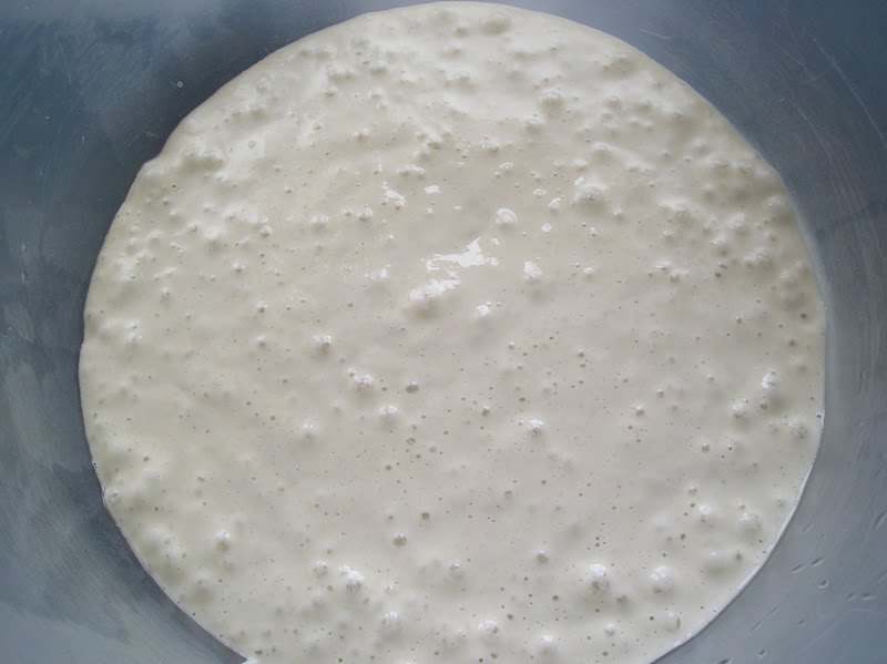 Este primer refresco me iba a servir para hacer un bizcocho de chocolate con MM, pues no es necesario una MM muy activa dado que también lleva algo de levadura de repostería (química, no biológica). Y tras 6 horas, la MM pasó al cuenco donde debía preparar el pastel de chocolate con este aspecto. No ha crecido de manera espectacular, pero está viva y coleando. Y para el bizcocho tenía suficiente vigor.