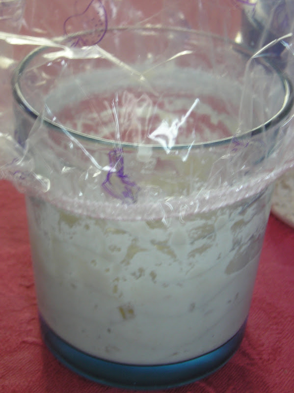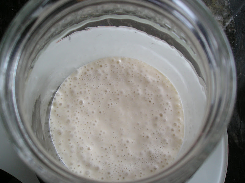 Al cabo de esas 12 horas, alimenté el líquido traslúcido con 50 gr. de harina y mezclé bien. Marqué con una etiqueta el vaso en el cual los copos habían estado “en remojo” antes de incorporar la harina.