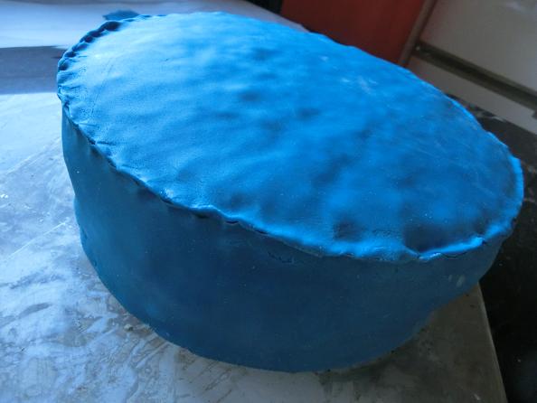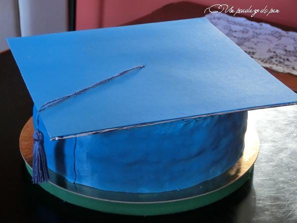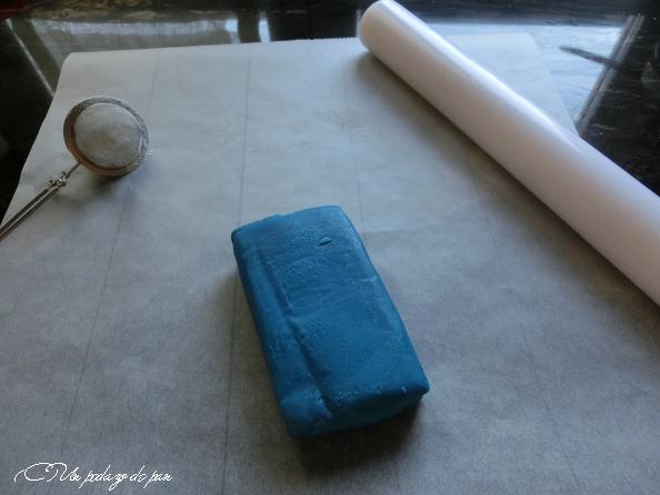 Ahora queda la parte “artística”: transformar nuestro bizcocho en un bonete de graduación. Elegí el color azul porque es el que han usado en el colegio para la pequeña “orla” de los niños que terminan primaria y pasan al instituto. Debo confesar que compré el fondant no sólo hecho, sino coloreado.