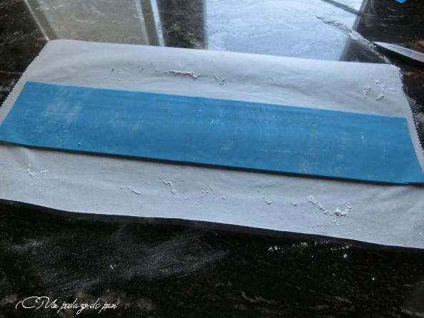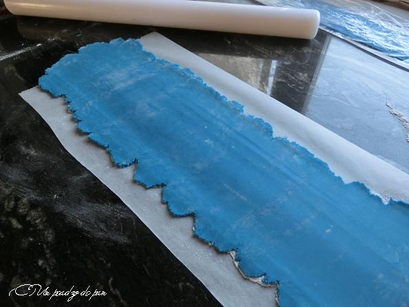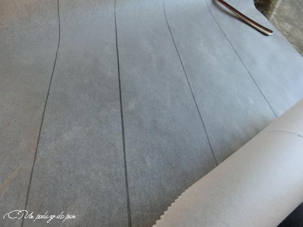 Para lograr extenderlo sin gran desperdicio en línea recta, dibujé líneas paralelas de la anchura deseada con lápiz y regla en papel de hornear. Le dí la vuelta y las líneas me servían de guías, primero para el estirado y luego para recortar el fondant.