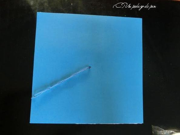 Eso sí, el acabado último era un cuadrado de cartón fino, de 26 cms. de lado (un par de centímetros mayor que la tarta en sí), forrado con papel aluminio, para que pudiera estar en contacto con la tarta y recubierto en la parte exterior de un cuadrado de cartulina azul en el mismo color que el fondant.