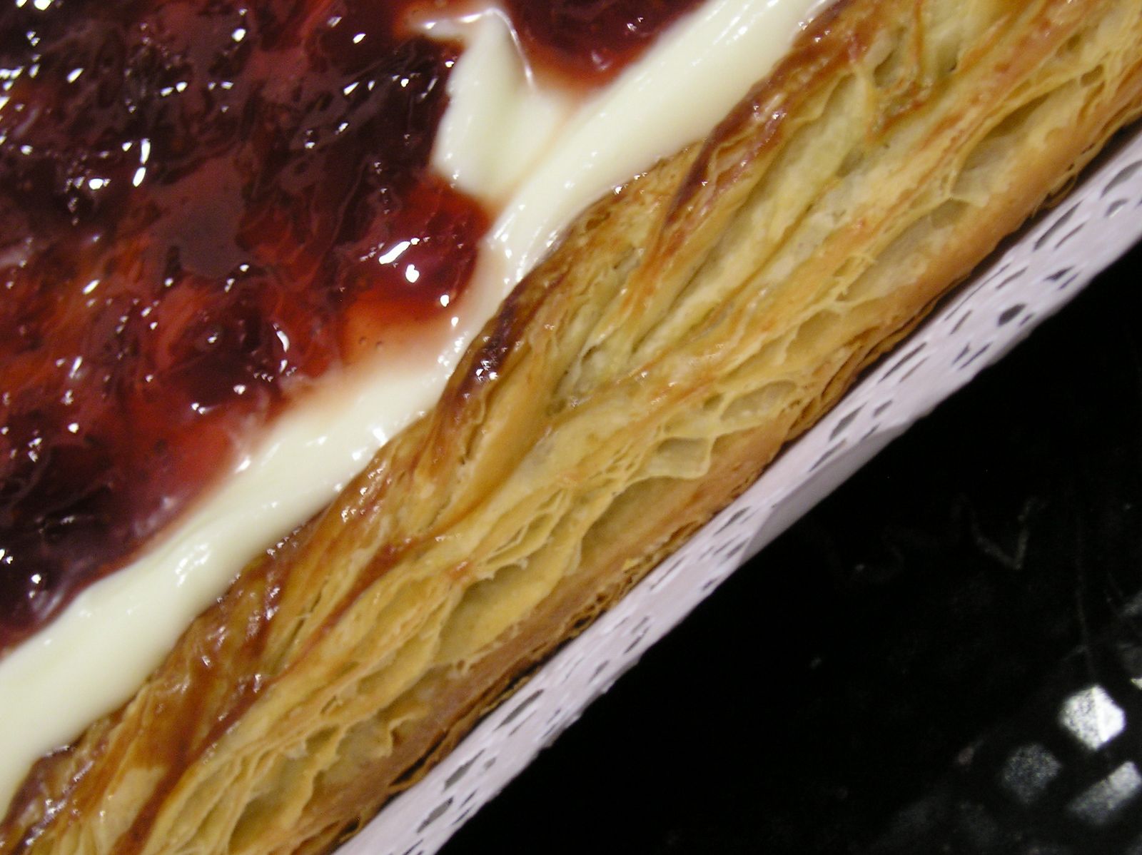 El hojaldre debe quedar muy bien cocido y crujientes las capas. Si se dora demasiado rápido, cubrir con film de aluminio. Cuando esté cocido, sacar del horno con cuidado, pues es muy delicado. Retirar el papel de horno y dejar enfriar bien en una rejilla.