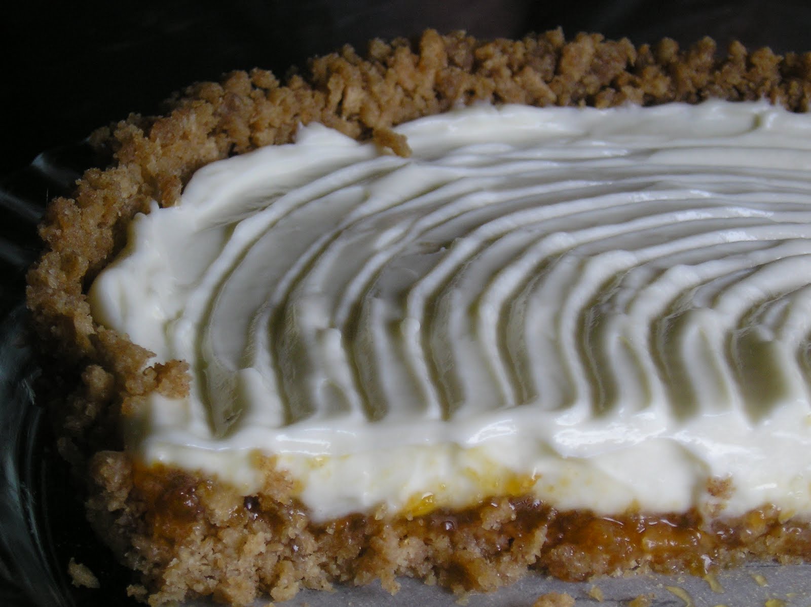 Tras media hora en la nevera, saqué el dulce de níspero, lo templé para que se extendiera bien y cubrí el fondo de la tarta. Y encima, para terminar, una crema de queso dulce, como la que usé en la tarta de hojaldre ligero, crema de queso y mermelada.
