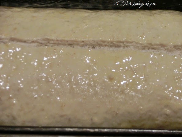 La solución para que un pan de molde no se deforme al hornear si no está perfectamente fermentado “à point”, es greñarlo. En lugar del corte longitudinal de otras ocasiones, pensé que ya que tenía las tijeras en la mano, haría cortes de tijera en zigzag.