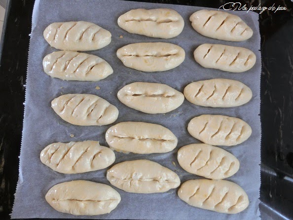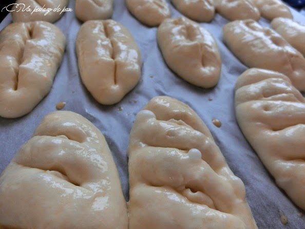 Como la masa llevaba mantequilla y el día estaba ya cálido… pensar en greñar las piezas era imposible. Por si fuera poco, el baño de huevo hacía que su superficie estuviera blanda y pegajosa… “enemigo nº 1” de la cuchilla panadera.