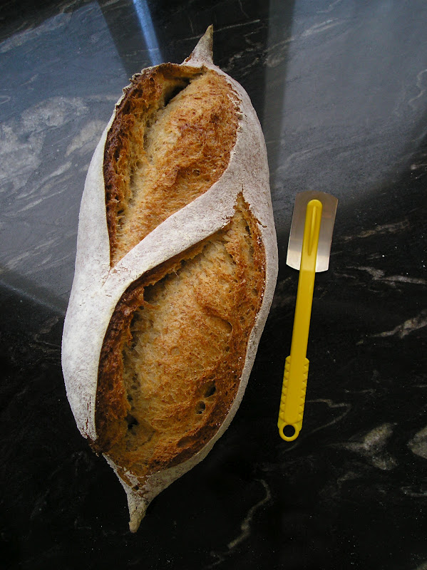 Llevar al horno, sobre piedra refractaria y con vapor abundante. Bajar la temperatura a 230º y hornear 15 minutos. Abrir la puerta 15 segundos para dejar salir el vapor. Seguir horneando 20-30 minutos más en seco a 210º, hasta que adquiera un bonito color la zona de los cortes. El resto de la hogaza, al estar enharinada, no se tostará tanto (aunque desarrollará una buena corteza).