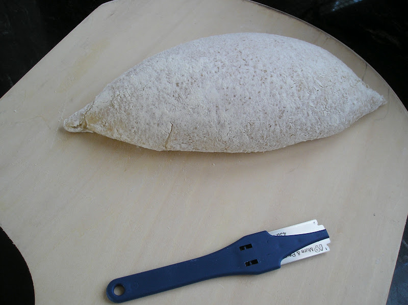 He utilizado dos tipos de cuchillas diferentes: una curva y otra recta (una nueva que me acaba de enviar El Amasadero, que permite cambiar las cuchillas). Pero además he utilizado dos formas de greñado diferente. En un caso una greña perpendicular a la superficie del pan y en otro caso una greña en un ángulo de unos 45º con respecto al pan.