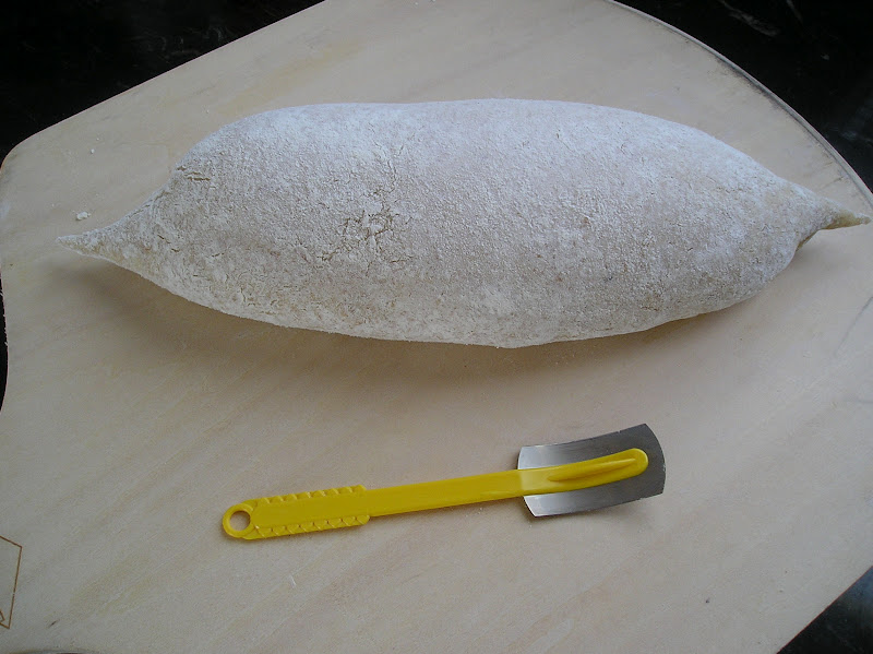 Sacar la masa del cuenco y desgasificarla suavemente. Dividr la masa en dos porciones del mismo peso (unos 425 gr.). Darles forma de batard o barra y hacer rodar afinando los extremos, procurando mantener una buena panza de pan.