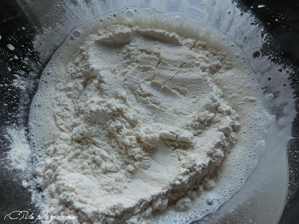 Para ello pesar la MM activa en un cuenco, añadirle el agua y batirlas juntas. Con ello incorporamos oxígeno a la mezcla, que harás que las levaduras -no las bacterias, pero sí las levaduras- se reproduzcan con alegría (a esto se llama fermentación aeróbica, en presencia de aire).