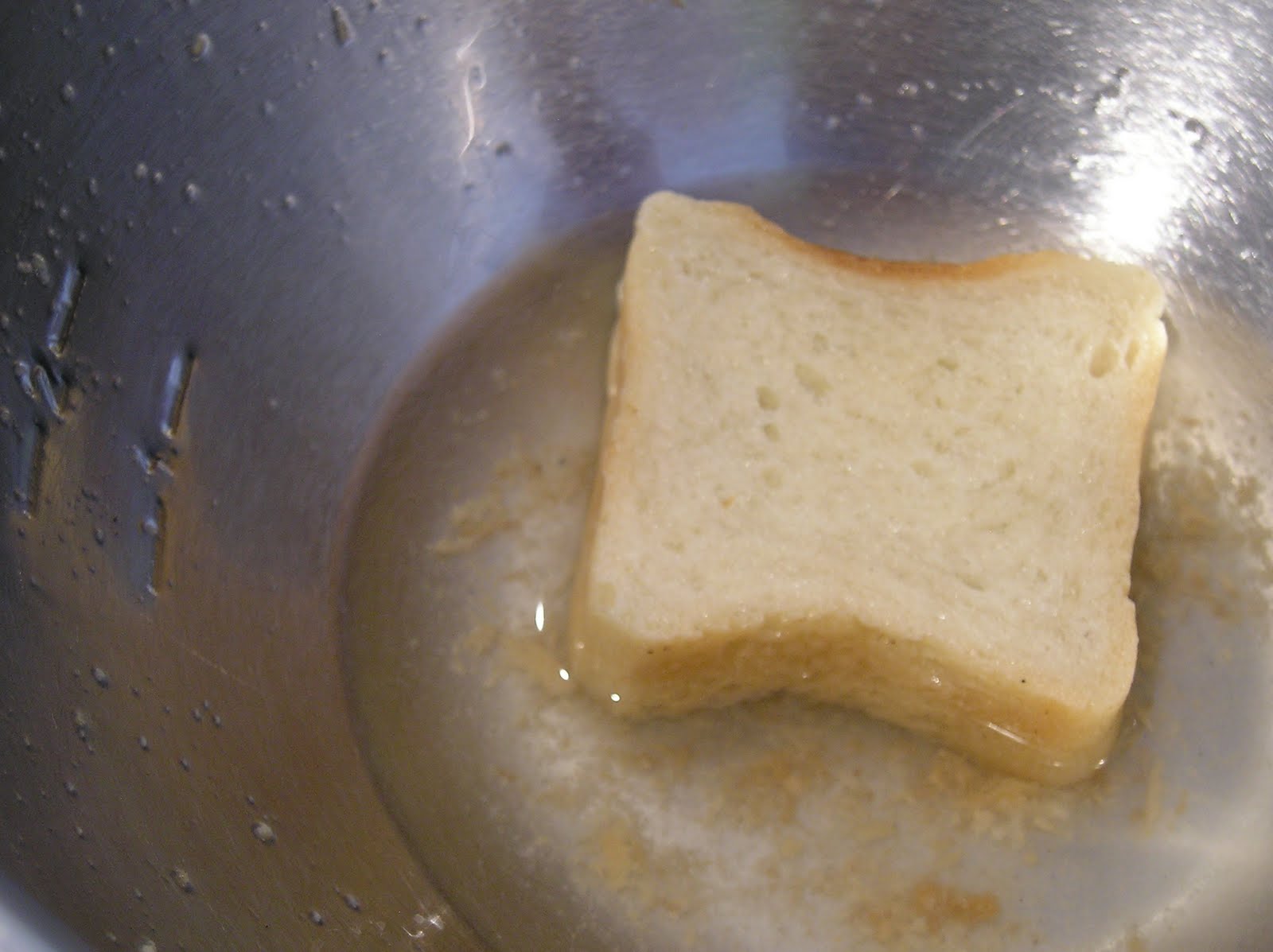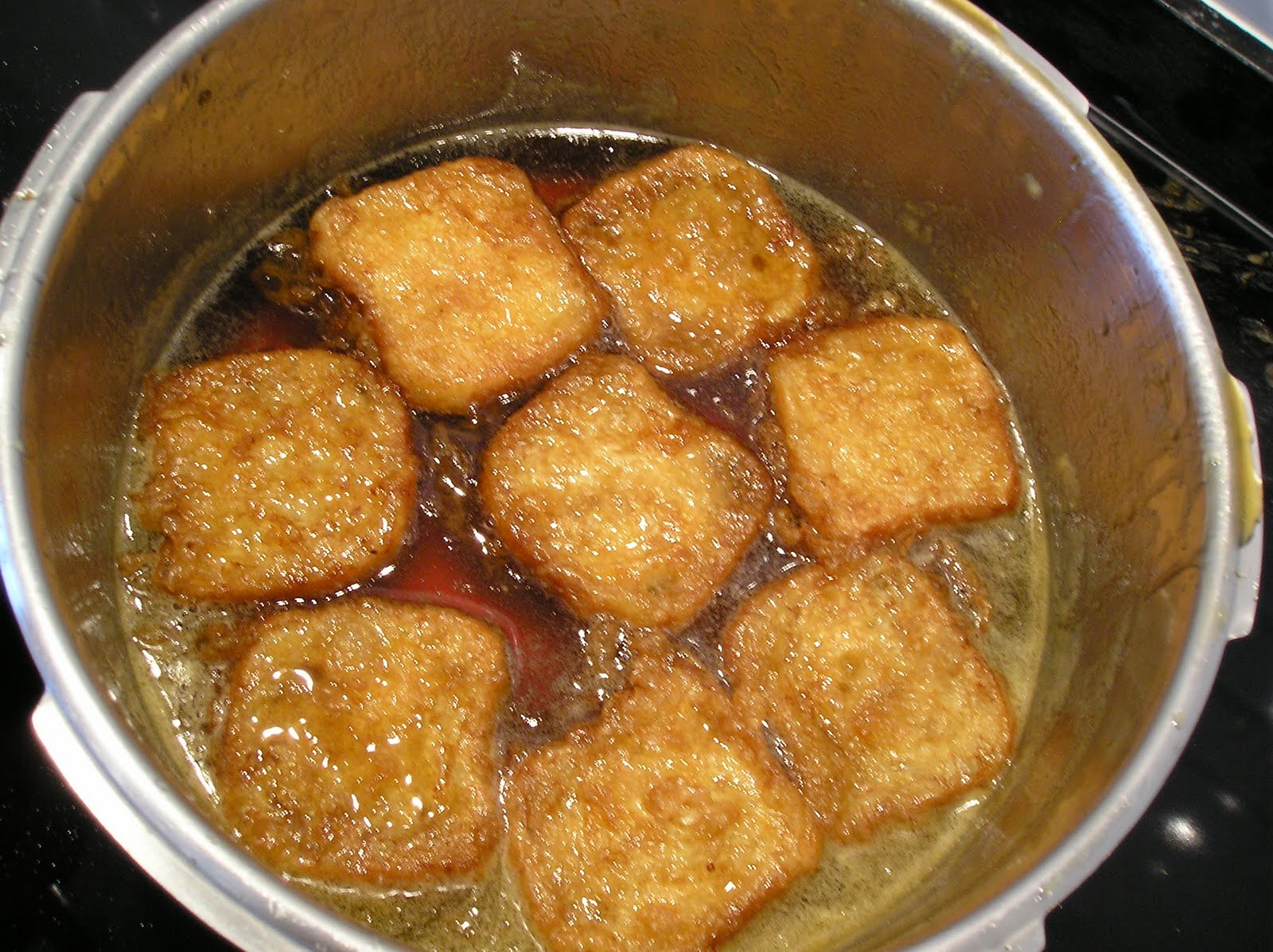 Cuando me ha llegado el momento de tomar el testigo -ahora ella las disfruta al llegar estos días primaverales- yo he optado por las torrijas pequeñas. Siempre el placer parece mayor si en lugar de una torrija -grande- uno puede tomarse tres o cuatro -pequeñas, claro-. Y permite además a los que deben moderar su consumo de azúcar o de calorías disfrutar de una pequeña ración.En Sevilla las torrijas son de pan de molde y enmeladas. El pan es especial para torrijas, muy denso y asentado. Se hacen tanto en tamaño grande como pequeño: las torrijas grandes se hacen con un pan de aproximadamente 10×10 cms. (una vez hechas y esponjadas las torrijas quedan como de 12×12 cms); la torrijas pequeñas se hacen con un pan de 5×5 cms (unos 6×6 cms una vez hechas).