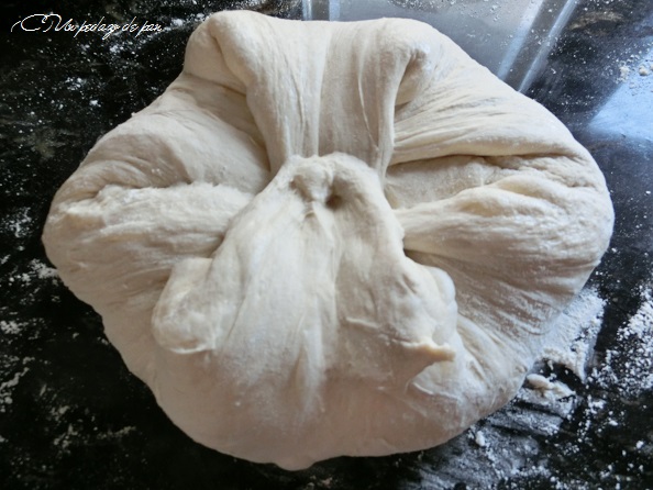 Formar en bola, con mucha tensión superficial. Enharinar generosamente y colocar en un banetón o cesto redondo.