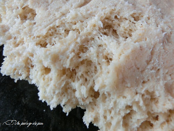 La verdad es que no tiene nada que ver con el pan moreno tradicional, pan gaditano por excelencia, porque he salido de la franja de hidratación del 45-50% y me he ido hasta un 68% de hidratación. No quería un pan de miga sobada, que eso sé que sale estupendamente, sino lograr un pan ligero. Y esta miga puede ser prueba de lo que se logra con esta harina y con un poco de maña.
