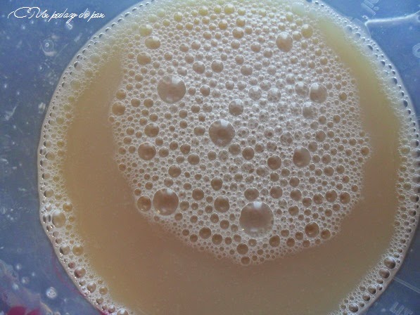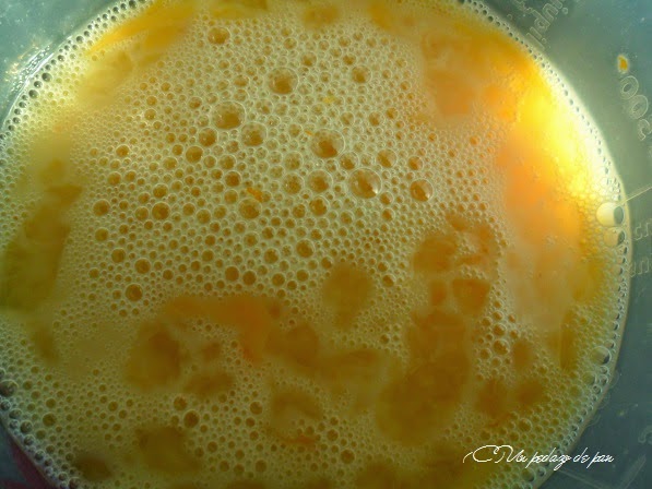 Cuando están bien deshechos y la leche tibia, se añade el agua de azahar y los huevos ligeramente batidos. Se mezcla todo bien.