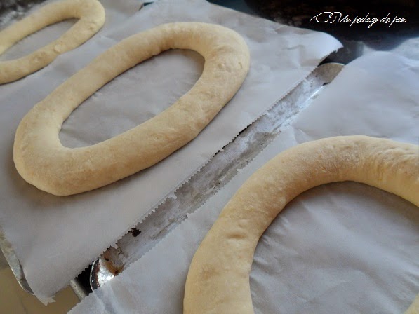 Hay varias formas de hornear estas piezas, según recetas. En este caso yo opto por introducir el roscón a máxima temperatura, sin vapor durante dos minutos y con papel pero directamente sobre la chapa o la piedra para que crezca al máximo.
