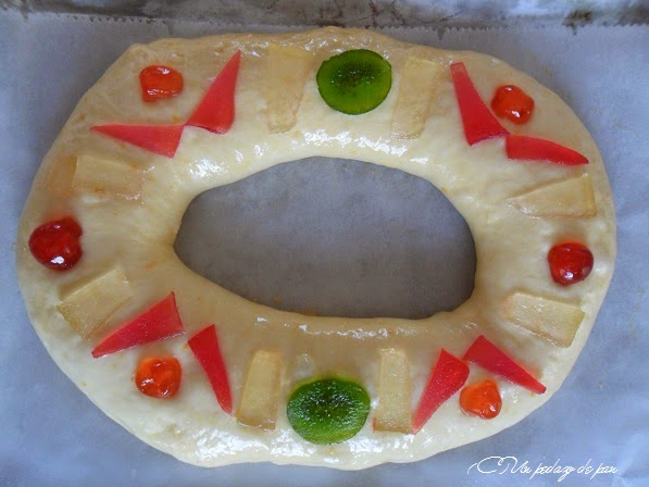 Ufff, no sé calcular el tiempo para un roscón tan grande. No debe ser mucho más, porque será más largo y le llegará el calor bien repartido… pero quizás después de los 15 minutos iniciales controla el color del roscón y si hace falta al final lo tapas con papel aluminio para que no se retueste y esté bien cocido. Debería haber una fórmula de cálculo… pero yo aún no la tengo, sniff