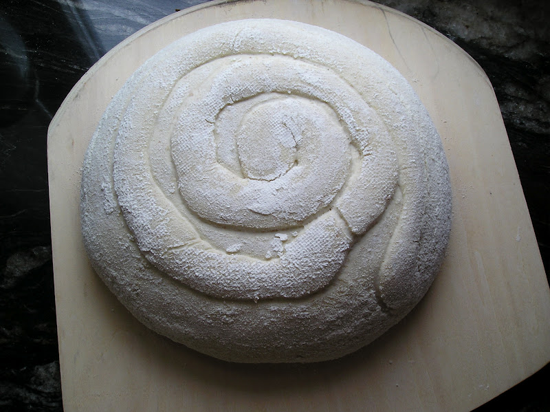 Con el trozo de masa pequeño hacer una larga cuerda y enharinarla. Colocarla en espiral en el banetón o cestillo en el que vayamos a fermentar el pan. Encima, colocar la masa principal con la unión o sellado hacia arriba. Tapar con un gorro de plástico de uso alimentario.