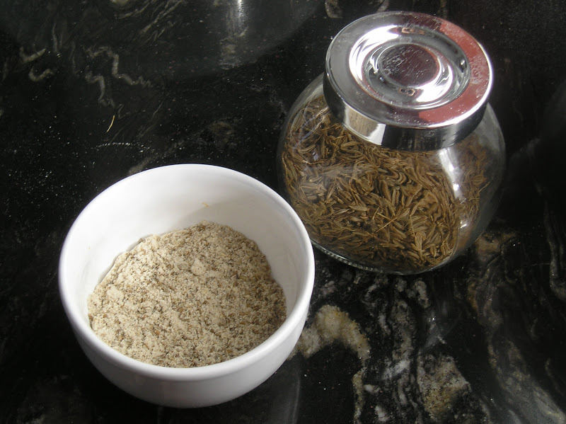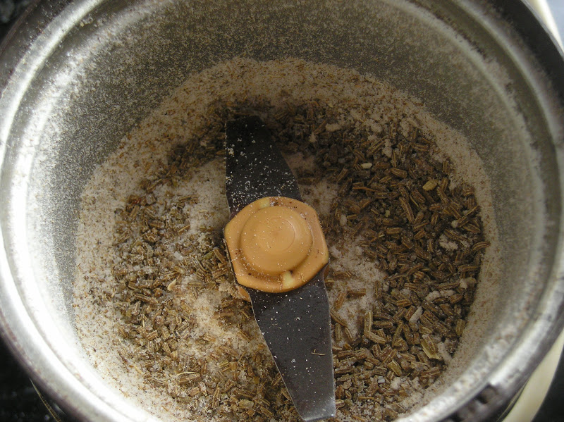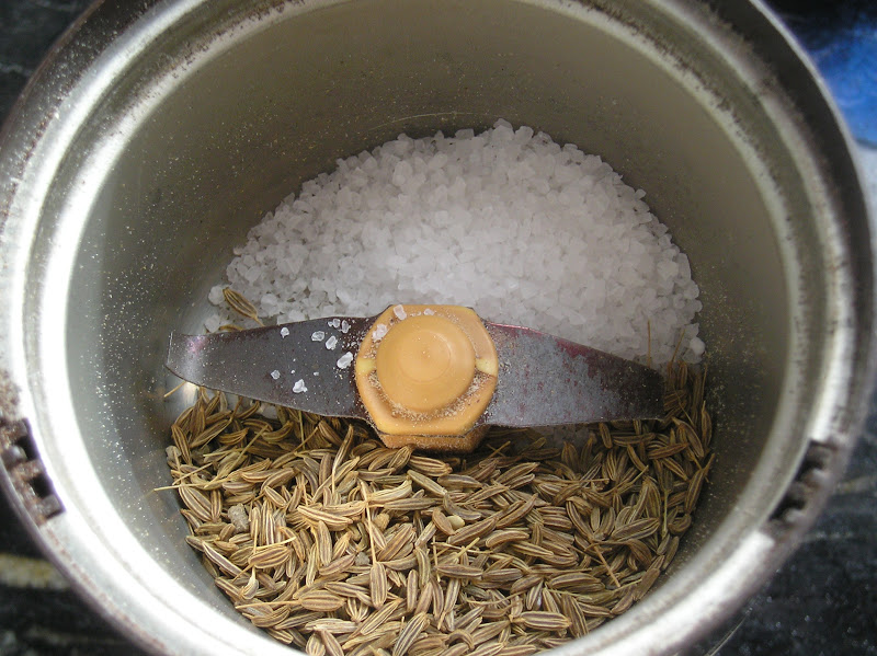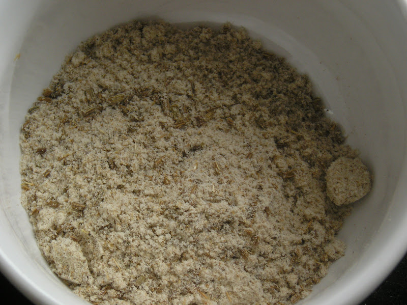 Añadir la sal y la alcaravea. Puede añadirse la especia entera o molida. En este caso, molimos la alcaravea con la sal gorda en un antiguo molinillo de café, que he reservado para las especias de panes y dulces. La cantidad de alcaravea puede variarse al gusto. De hecho y dado que en casa no han probado aún un pan con esta especie he reducido la cantidad a la mitad en esta primera ocasión.