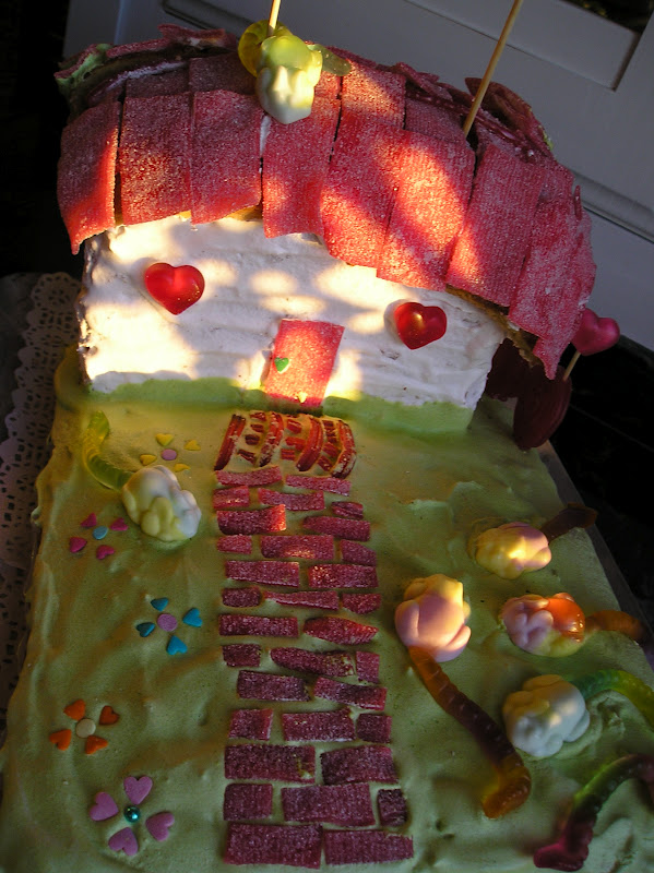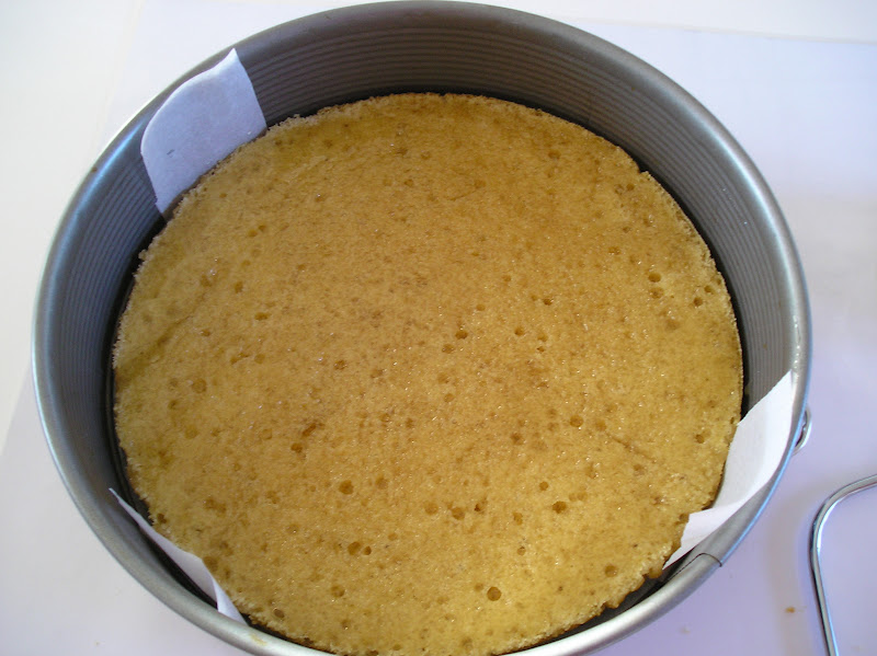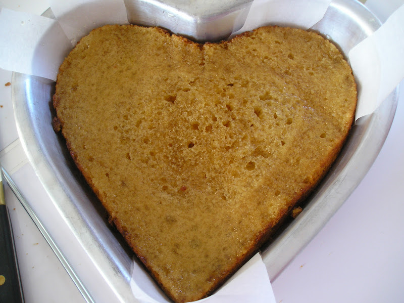 La tarta amorosa de corazones está hecha con una base redonda y un molde de corazón. Cada capa se ha partido a la mitad con los que resultaba una tarta de cuatro capas de bizcocho, emborrachadas todas con almíbar de cocer cortezas de naranja.
