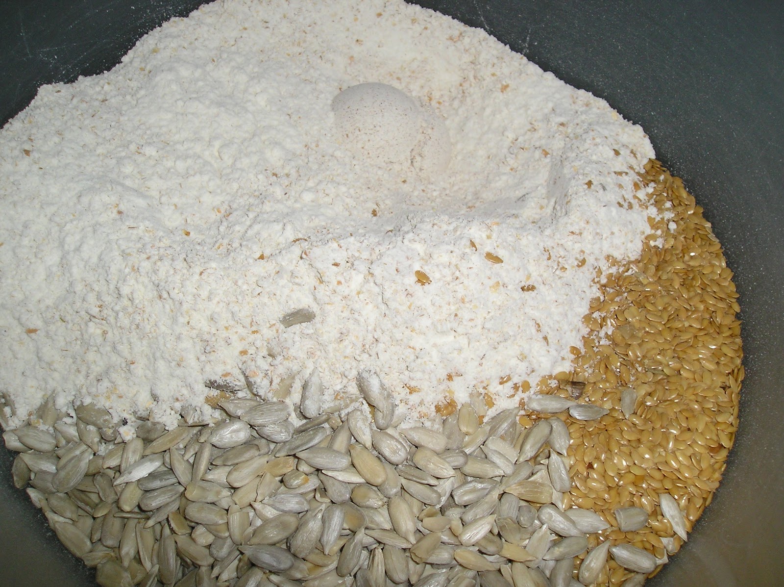 La receta original es del libro de Dan Lepard, Hecho a mano. Se titula “Pan de lino y trigo”, y la encontaris en la página 94. No obstante, le he hecho unas cuantas modificiaciones. No tenía semillas de lino marrón sino de lino dorado. Por otra parte y para darle algo más de variedad, substituí la mitad del lino indicado en su receta por pipas de girasol. Aumenté la cantidad de agua ligeramente. La masa que yo elaboré un 72%, y aún así, para mi gusto era una masa demasiado dura, teniendo en cuenta las semillas.