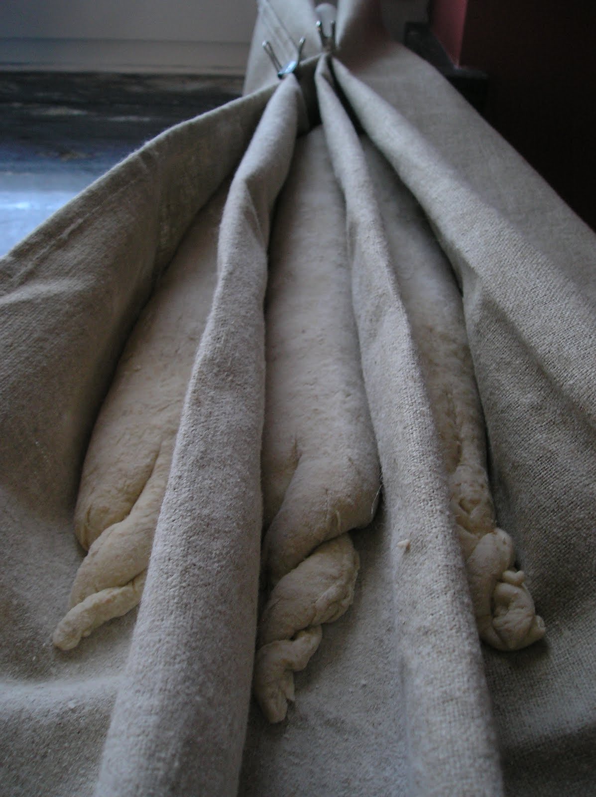 Cerrar la couche con pinzas, de manera que las baquetes crezcan lo más verticales posible. Calentar el horno a 220º.