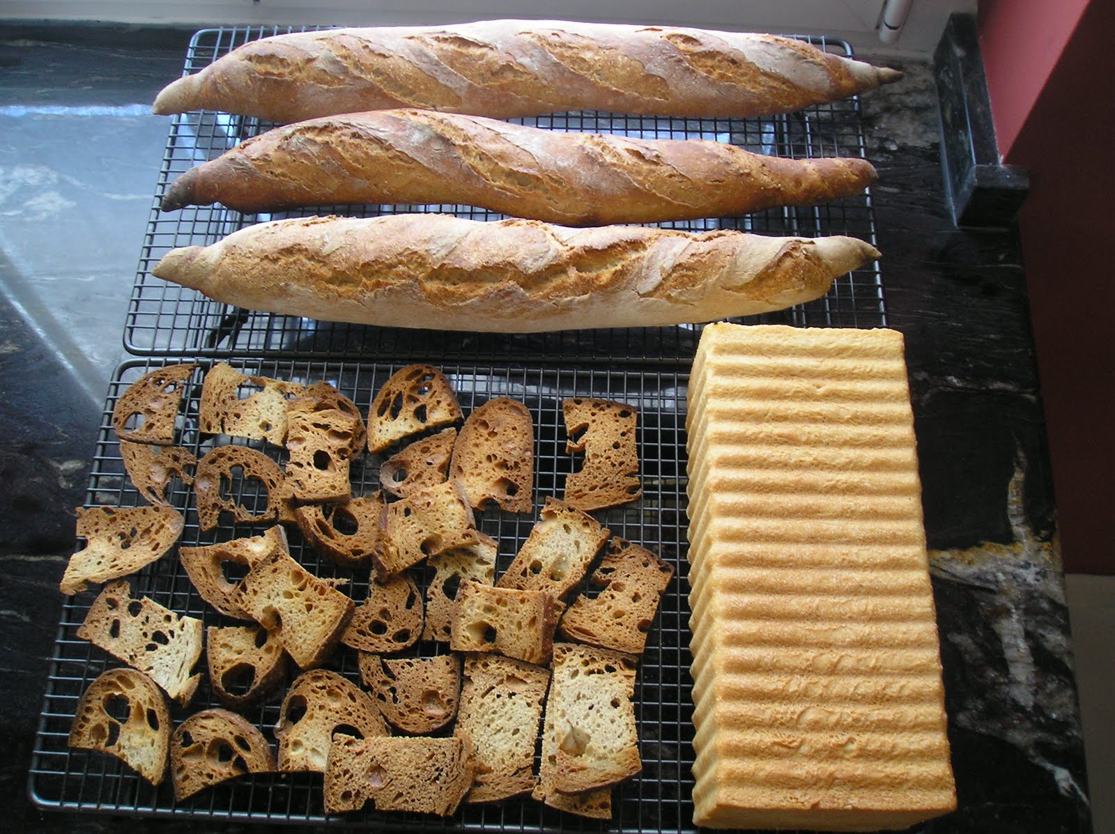 Estas son las baguetes de la última reunión familiar. Iban acompañadas de unas tostas (restos reciclados de la última hogaza, en realidad) y un pan de molde de semolina, tierno, muy tierno, para los sandwiches de salmón que devoraron -sobre todo- las niñas. Todos los panes juntos hacían un bonito cuadro. Pero mejor fueron las risas que los acompañaron. Lástima que aquí no se vean.