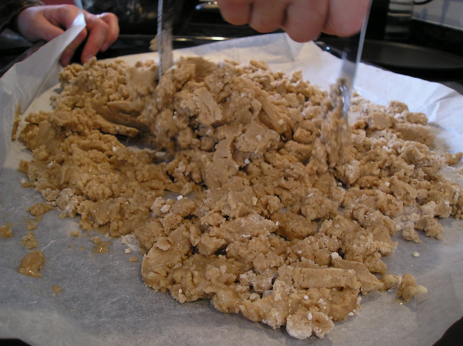 Mezclarla con el azúcar glas en caliente y dejarla enfriar. Añadir la canela, la ralladura de limón y la manteca. No se debe amasar sino cortar la manteca o desmenuzarla con un tenedor o un utensilio al efecto. Se irá convirtiendo en una masa.