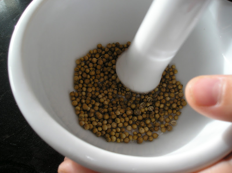 Majar en un bol las semillas de cilantro con la sal gruesa, si no se utiliza el cilantro ya molido. Si se opta por el cilantro ya molido -aunque es mucho menos aromático- utilizar sal final para la masa.
