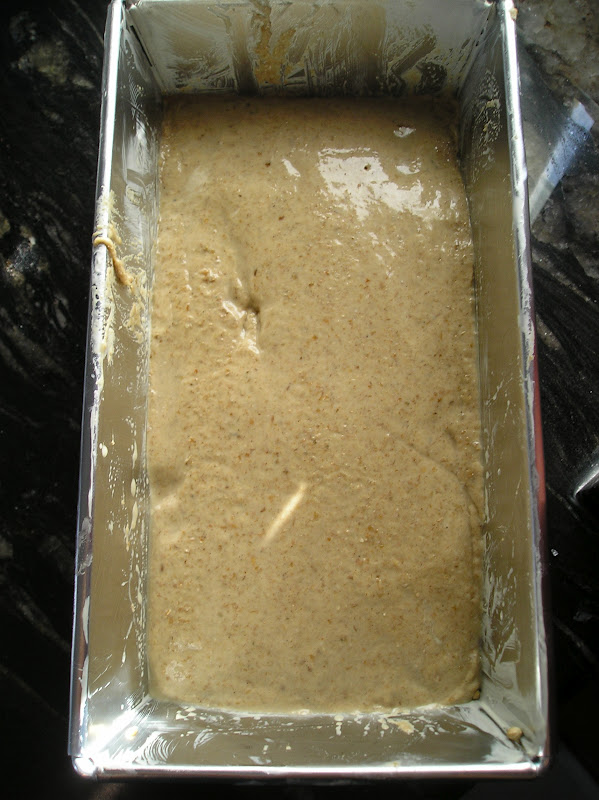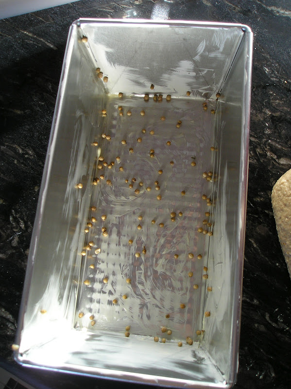 Engrasamos un molde de 20×10 cms. Espolvoreamos semillas de cilantro en el fondo. Si es de color claro es mejor: es un pan de cocción larga. Con el molde claro tardará más en tostarse el exterior y no hará una corteza tan dura.