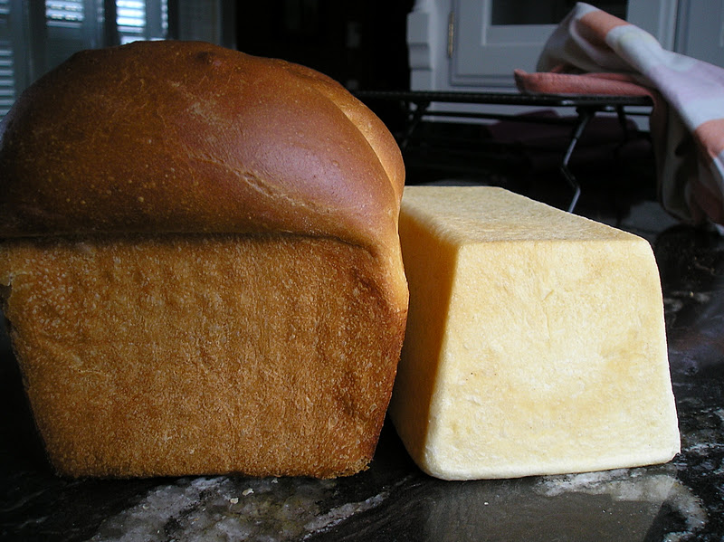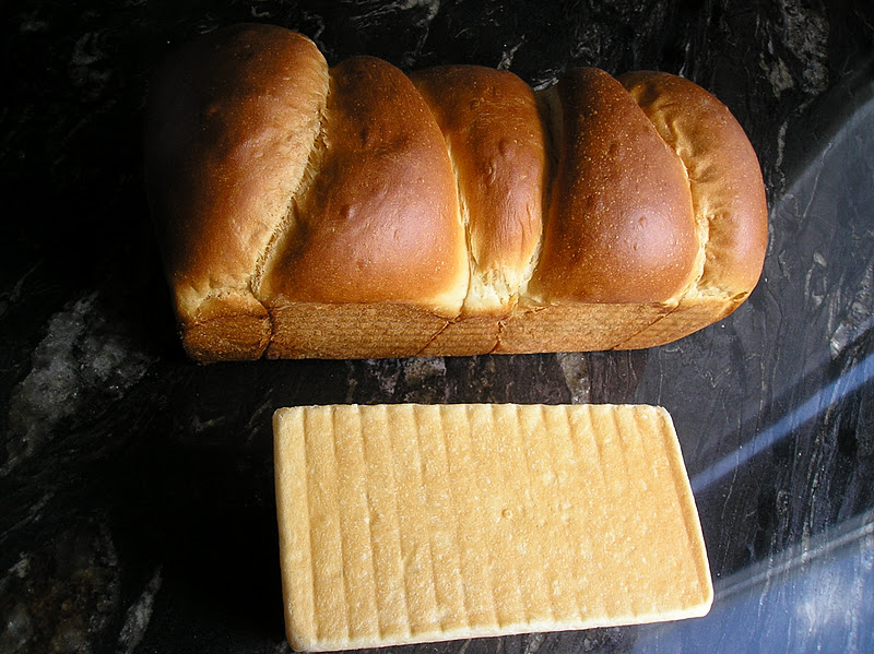 Pero además, el molde pequeño es de aluminio claro. El molde del pan mayor es de los que está recubierto de teflon antiadherente (lo era cuando estaba nuevo), de color negro. Y por eso, el pan, necesariamente, se tuesta mucho más. Si quereis panes y bizcochos de acabado claro, es mejor utilizar moldes de aluminio sin recubrimiento. Si os gustan tostaditos, un molde oscuro hace parte del trabajo para lograr un buen tostado de la superficie. Por eso, si horneais un bizcocho de chocolate, se recomienda siempre un molde claro de alumnio, pues el chocolate amarga en cuanto se tuesta de más.